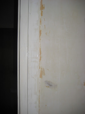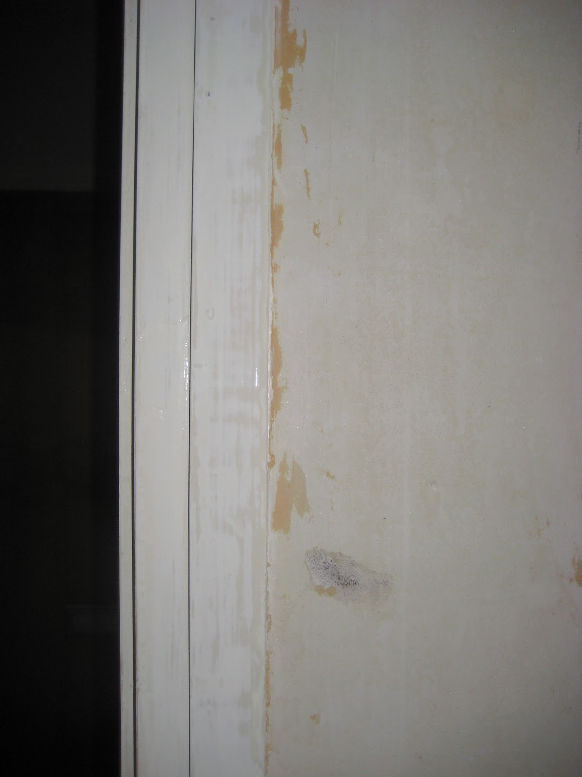 No nyt on seinistä kaikki tapetit rapsutettu pois ja seinät ovat puhtaat! Seuraavaksi seinät ja katot tasoitellaan uusiksi ja sitten pohjamaalataan. Eilen hioin hiomahiirellä ovien listoista kiiltävän maalin pois ja tämännäköistä jälkeä syntyi